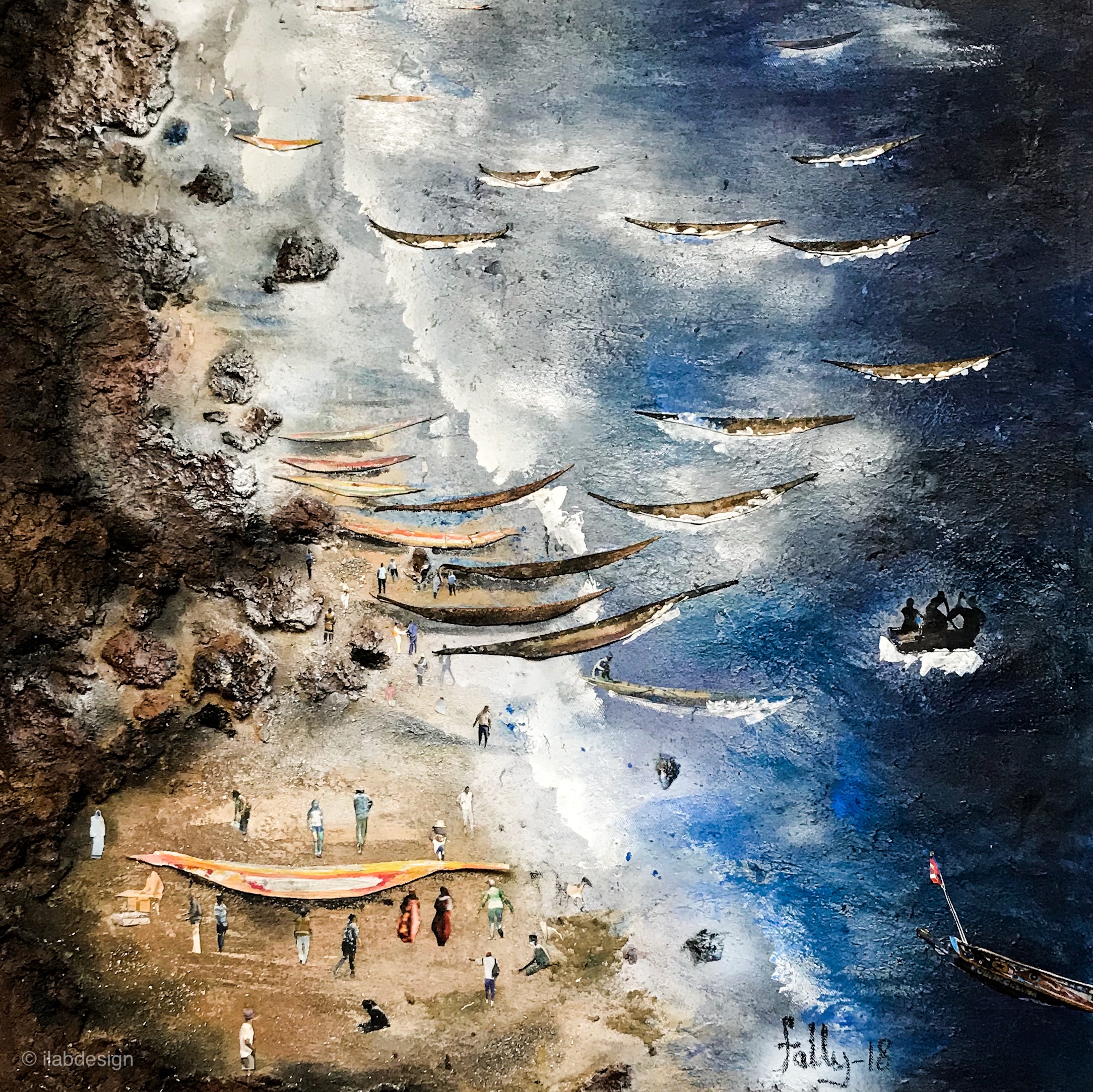 Avec ses collages entremêlés de peinture, Fally Sene Sow réinvente la technique du sous-verre. Ilab-design a eu une véritable coup de foudre pour cet artiste plasticien et poète d’une gentillesse qui n’a d’égal que son bavardage et sa gaité.