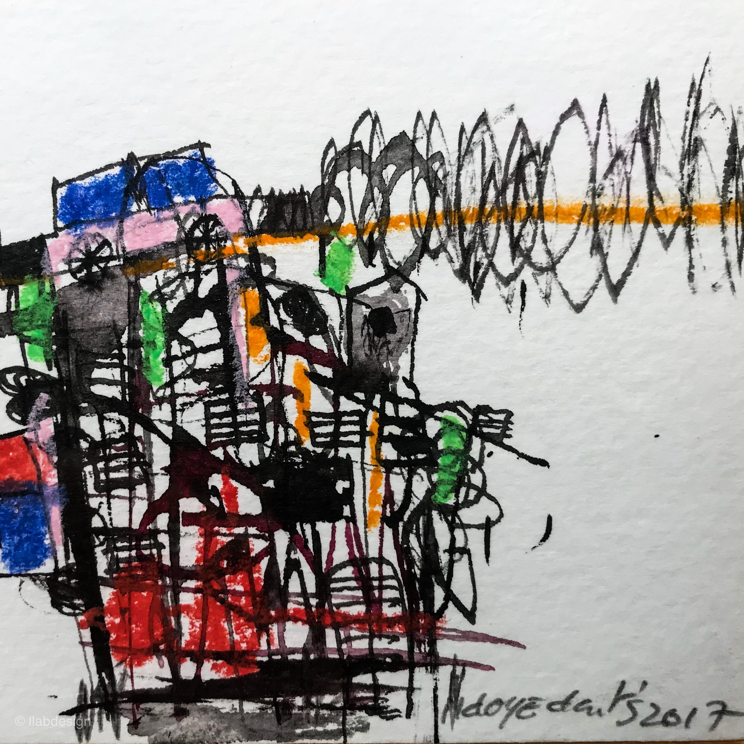 Ilab-design a été séduite par le langage pictural de N’Doye. Du haut de l’immeuble où se trouve son atelier, cet observateur silencieux écoute et sent la cité. Le tourbillon de la ville et le brassage des cultures en milieu urbain l’interpellent: « Comment les gens vivent-ils dans les quartiers populaires » ? Et c’est précisément à cette question que son travail essaie de répondre: sa peinture explore et transfigure ces enchevêtrements bariolés de formes, de matières et de couleurs, les contaminations réciproques de l’architecture et de la vie, les lignes autour des quelles la ville s’étire et flotte dans l’espace.
