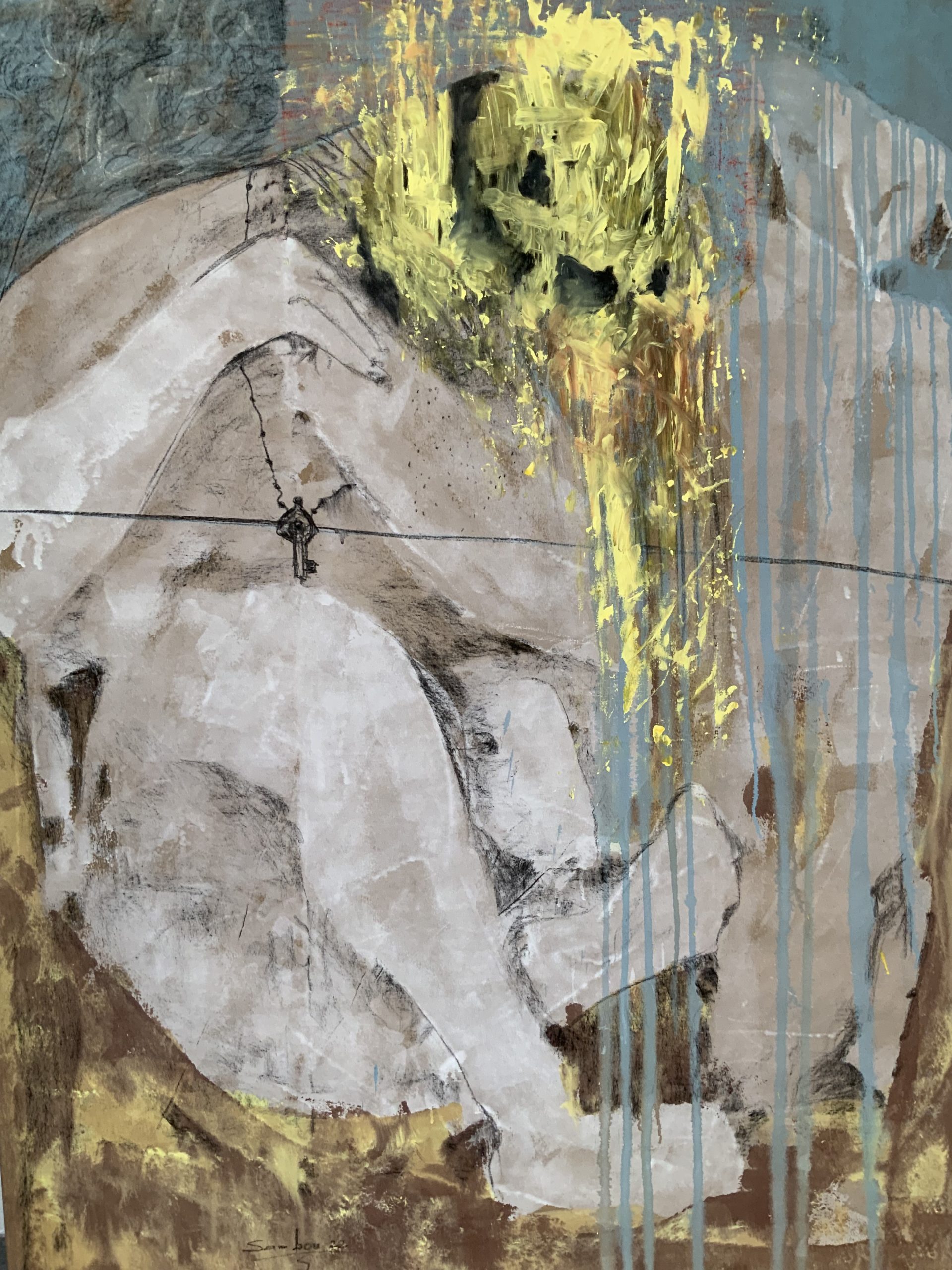Les œuvres de Sambou Diouf sont une invitation au voyage vers un autre réel. Leurs personnages aux silhouettes atomisées et aux visages déformés sont des exorcismes picturaux.