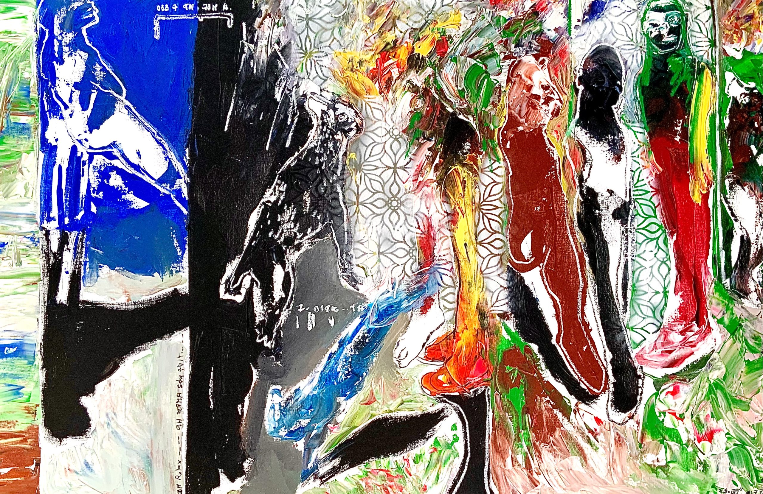Soly Cissé, né à Dakar et élevé près de la mer, puise dans la beauté et parfois la violence de la nature pour son art. Les nuances de bleu représentent la mer agitée, tandis que des touches de blanc, jaune, rouge et noir décrivent les rochers de basalte où les enfants pêchent. Inspiré par les radiographies de son père, médecin, le noir devient pour lui un révélateur, symbolisant les ténèbres primordiales. Son art, ancré dans la tradition mandingue, prône la tolérance et le respect. Chaque toile est une histoire complexe où se mêlent rites d’opposition et de domination, avec des figures de sagesse et d’espoir. Sa technique privilégie l’action immédiate, les éléments évoluant de l’extérieur vers le centre de la toile, pouvant être effacés pour laisser place à de nouveaux arrivants, symbolisant ainsi l’évolution perpétuelle des relations.