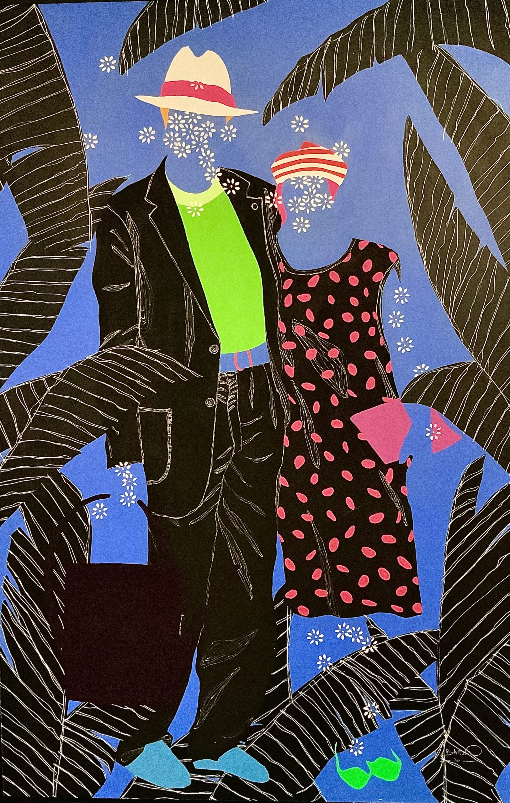 Couple Vintage Moustapha Baïdi Oumarou Détails techniquesAcrylique et Pigments sur toile Dimensions: 180 x 120 cm 2020 Œuvre encadrée