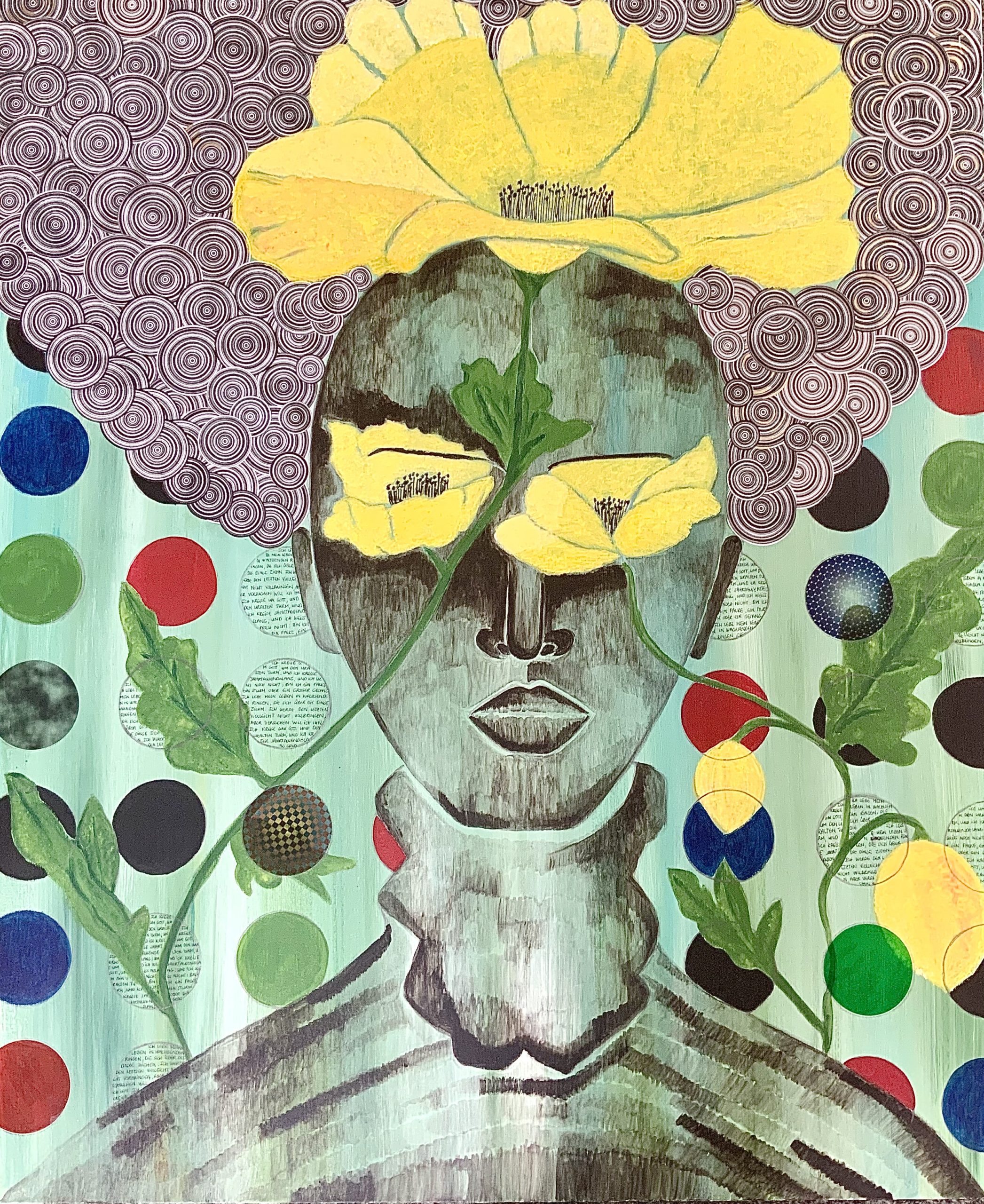 L’expression artistique de Myriam Kone est une ode à la femme, à la mère nourricière et à celle qu’elle est devenue: il est même possible de la reconnaître sur ses toiles à moins que ce ne soit son double, son autre moi.