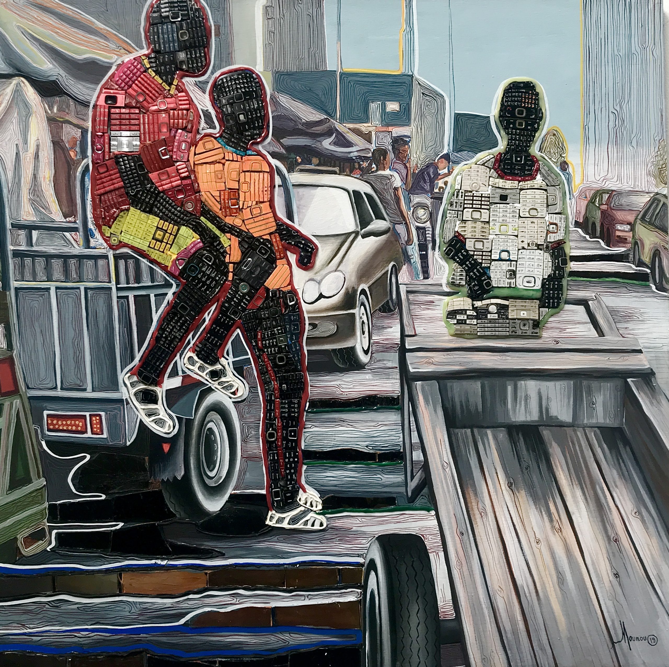 « Dans mes toiles, les êtres humains sont constitués de claviers car l’outil informatique prend actuellement le dessus sur notre humanité » déclare Mounou.