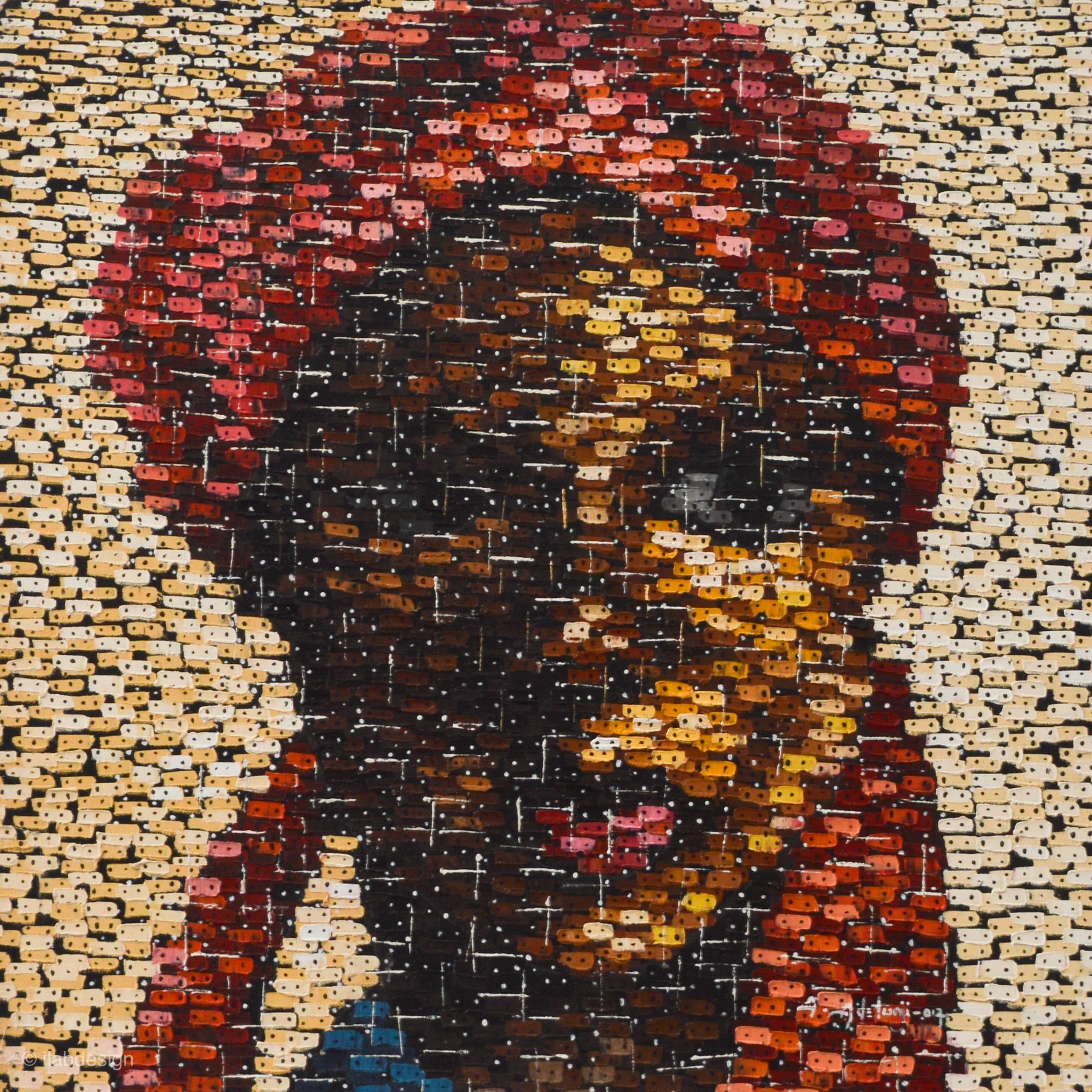 L’artiste d’origine nigériane travaille ses portraits à la manière pointilliste. Les petits rectangles de couleurs se superposent telles les pièces d’un puzzle jusqu’à restituer avec précision les traits de visages croisés sur les marchés de Lagos.
