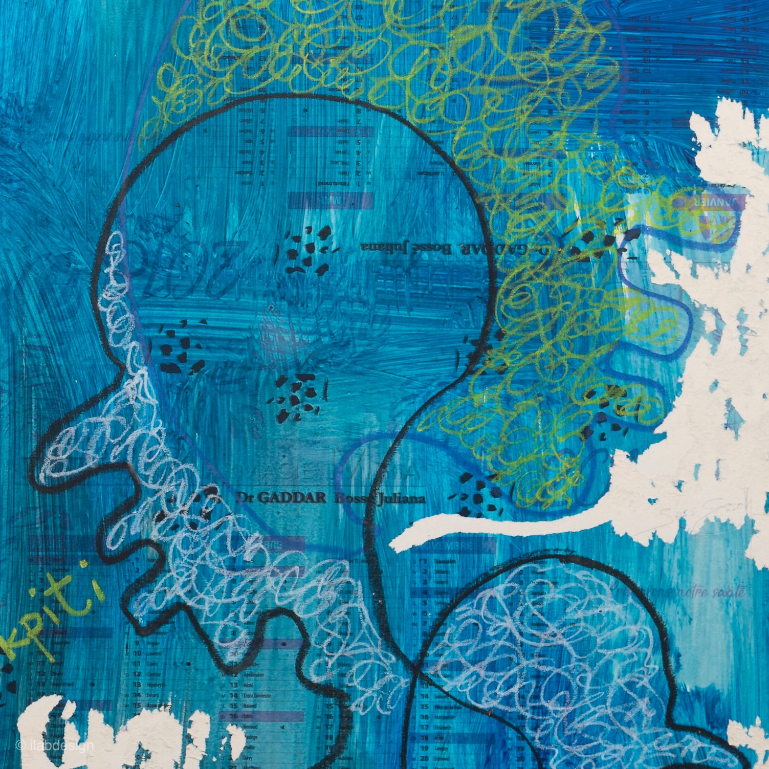 Pastel, acrylique et grattage sur papier