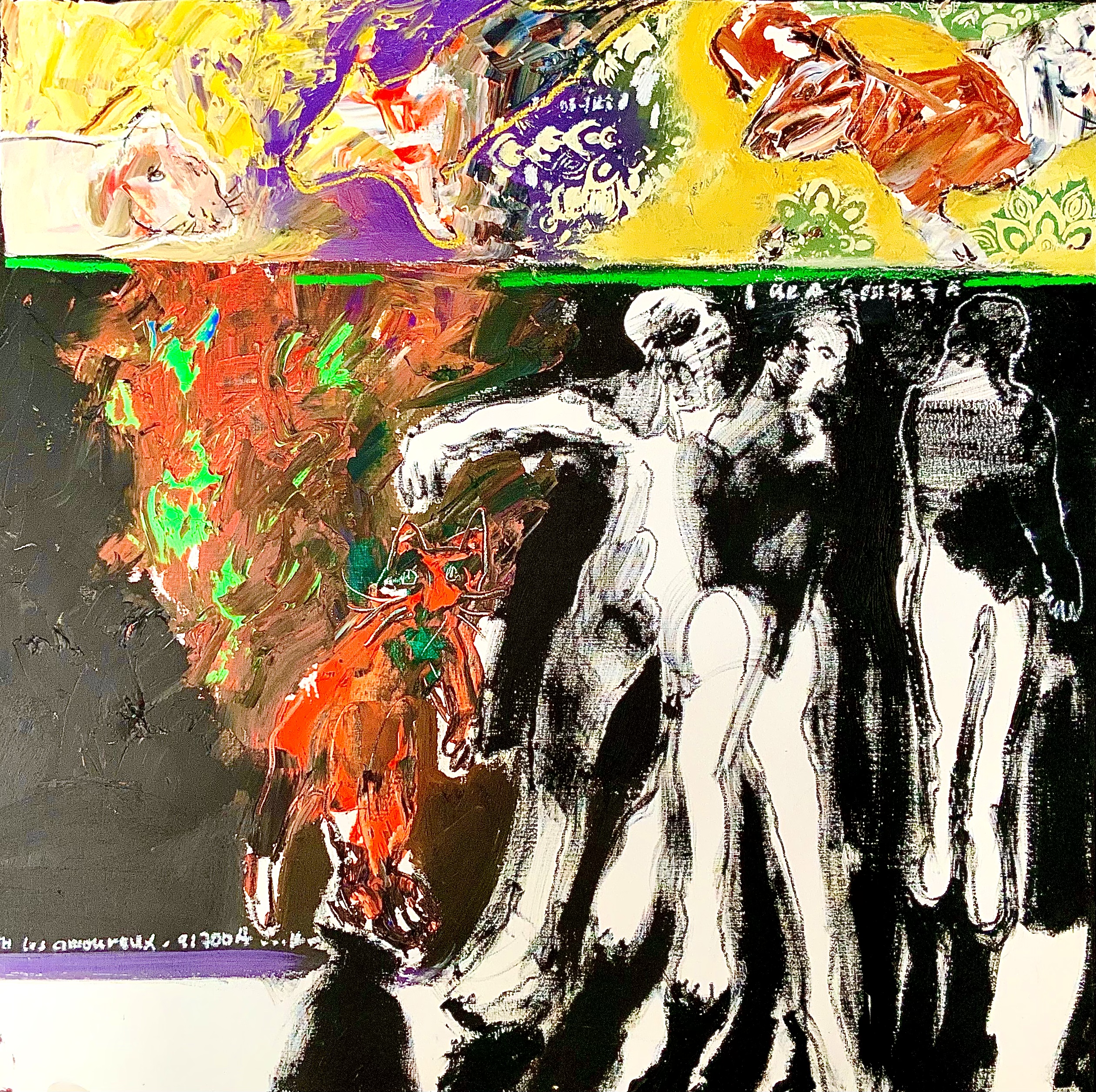Soly utilise de grands mouvements spontanés, des accents texturés et des techniques abstraites pour former des illustrations qui reflètent la décadence de la moralité de la société et les conséquences de la mondialisation et de la modernisation. Ses peintures fusionnent les formes humaines et animales en des personnages informes tordus dans les ombres humaines de l’autre moi. Ces hybrides improbables dont les identités se perdent dans la traduction du passé au présent avec des lignes abstraites et des traits audacieux de nuances contrastées créent une configuration stratifiée formant le monde magique de Soly Cissé qui semble rempli de ses divinités.