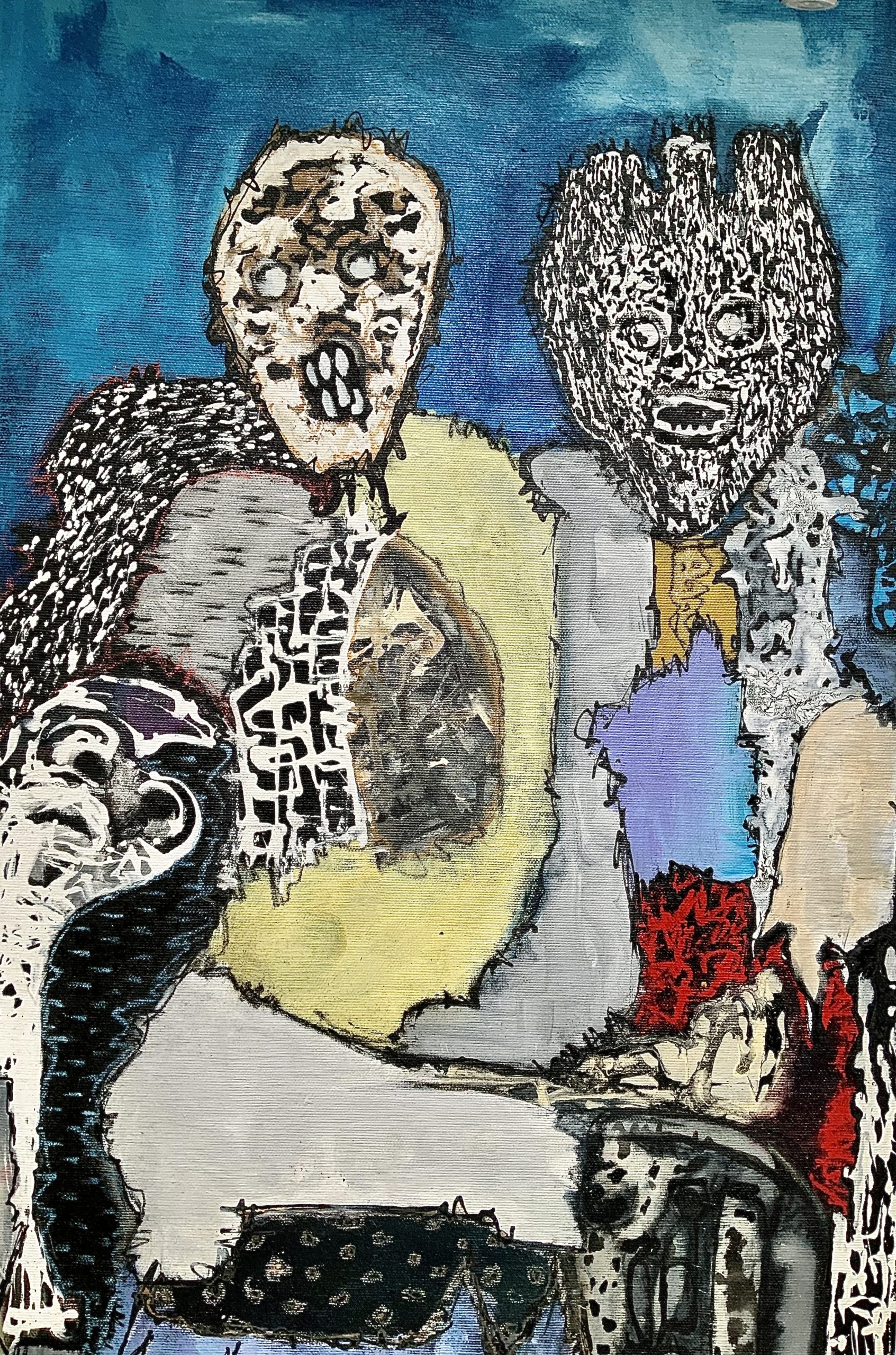 Technique mixte, acrylique, fusain, craie, pastel
