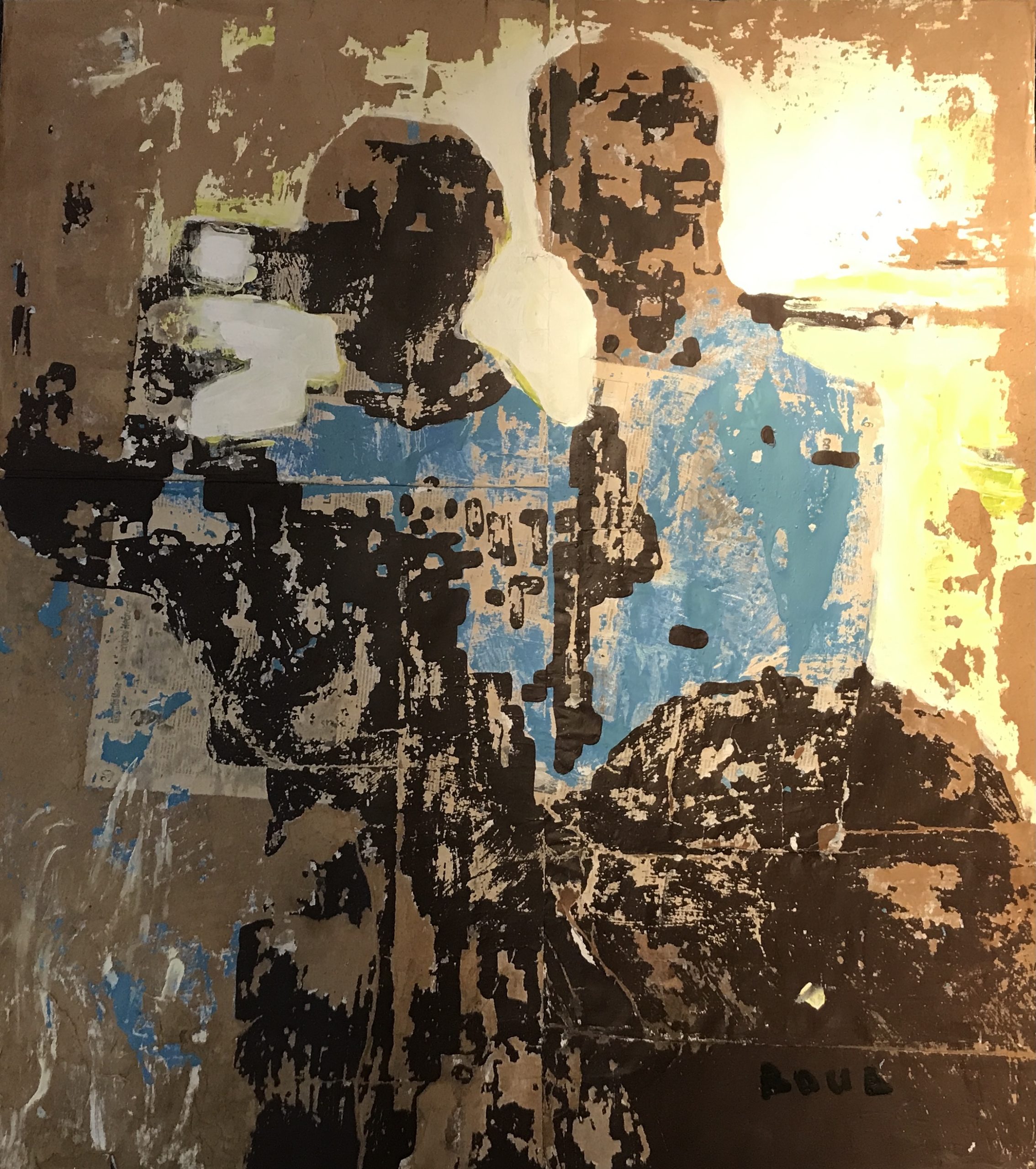 Les compositions d’Armand Boua (artiste ivoirien) se distinguent par une facture texturée grâce à l’usage du goudron, de l’acrylique, de papiers journal et de magazines mélés à des matériaux de récupération. Chaque couche est appliquée puis arrachée, dépouillée, laissant apparaitre des formes abstraites. Les mises en scènes sont, à l’image de la rue, déconstruites.
