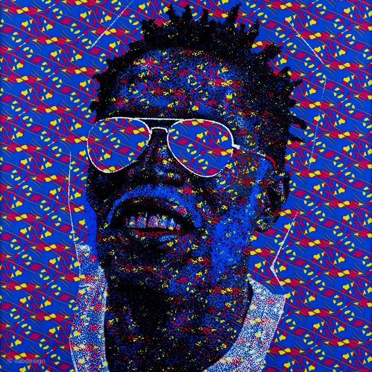 Il y a deux parties dans les œuvres d’Evans Mbugua. Le fond du tableau ressemble à un tissu couvert de motifs stylisés, répétitifs. Ces pictogrammes, l’artiste les repère dans les grandes villes comme Paris, où il travaille, ou Nairobi, où il est né. Par-dessus, sur une plaque de plexiglas.