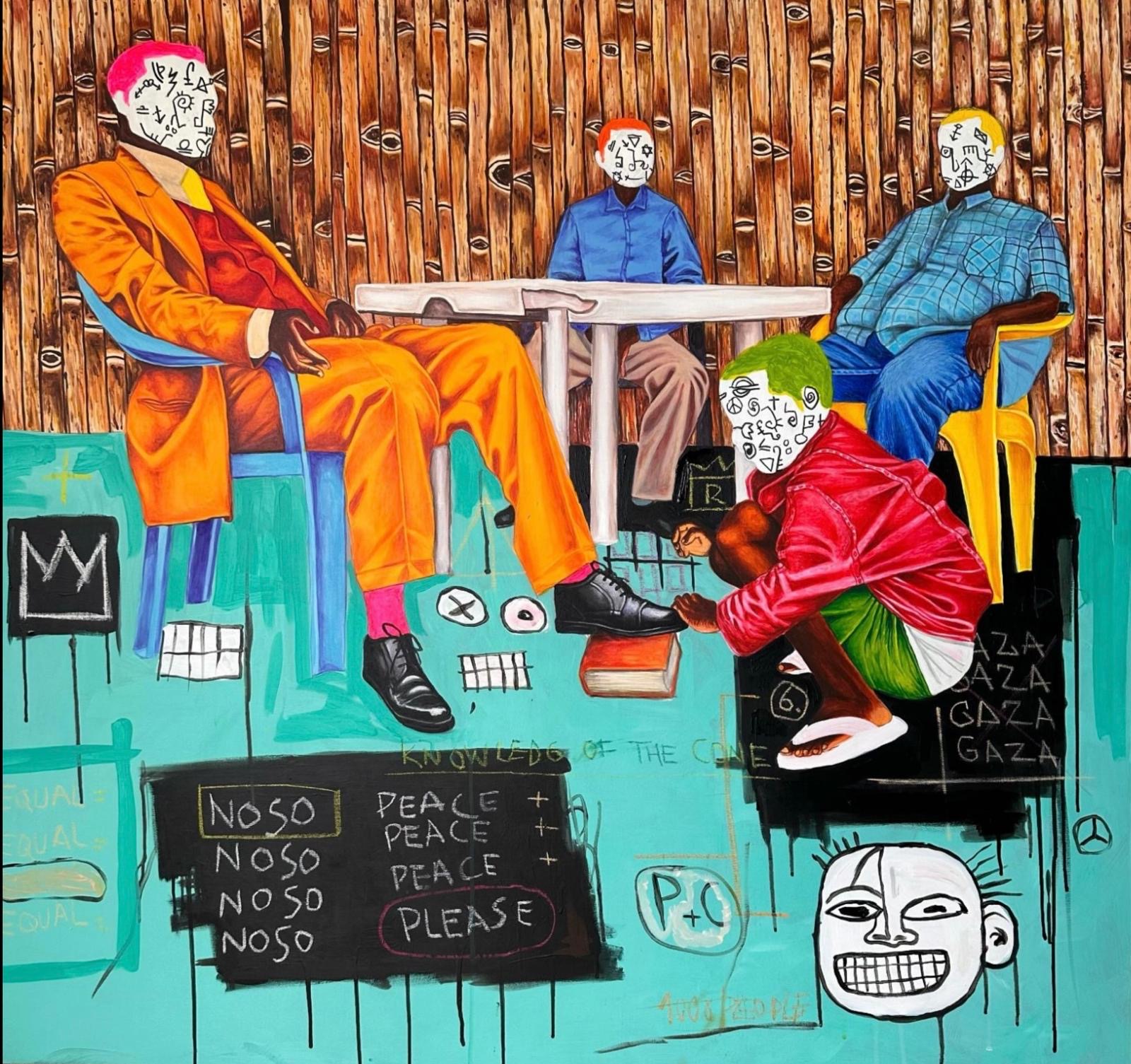 Ce tableau met en lumière la duplicité des élites politiques dans les régimes autocratique . Il illustre un système népotiste qui bafoue la constitution et néglige les droits humains. Les personnages autour de la table symbolisent les instances africaines et internationales qui, au lieu de rappeler aux États leurs obligations, restent des témoins passifs.